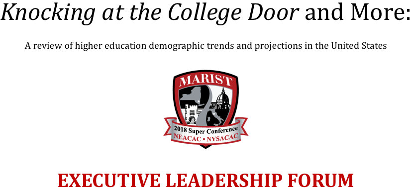 June 6, 2018 – Keynote Speaker – “Knocking at the College Door and More: A review of higher education demographic trends and projections in the United States,” Executive Leadership Forum at the 2018 New England Association for College Admission Counseling/New York State Association for College Admission Counseling Super Conference. [Poughkeepsie, NY]